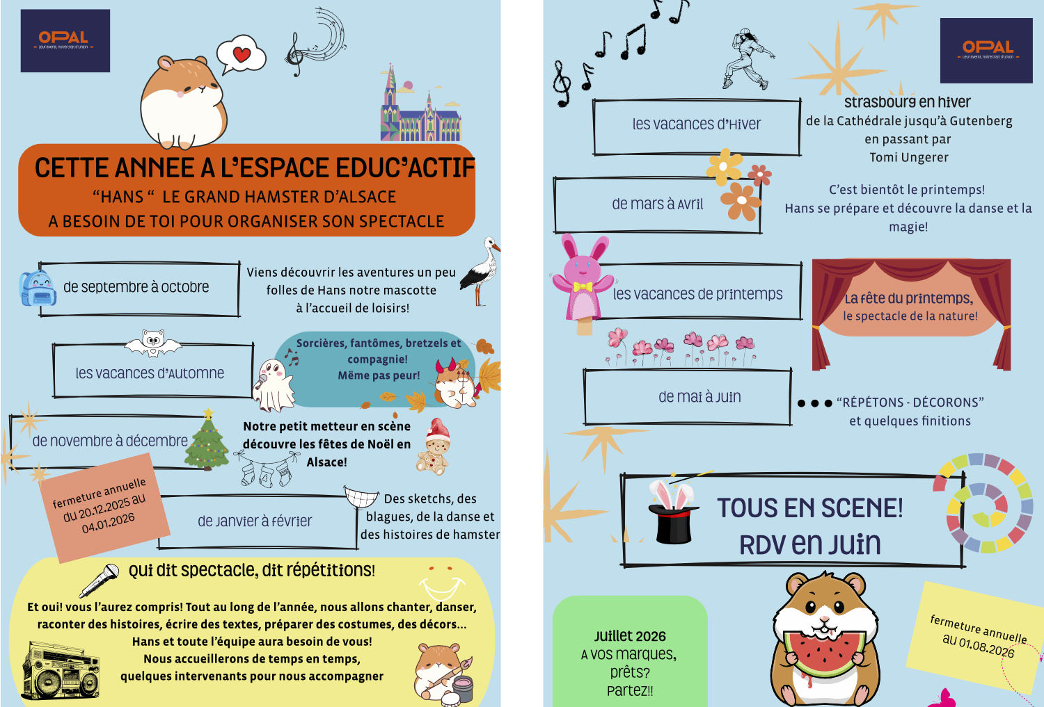 Cette année, notre projet pédagogique s’intitule « Hans, le petit hamster d’Alsace ». Guidés par ce personnage attachant, les enfants vivront une aventure riche en découvertes qui les mènera en Alsace à travers les époques.